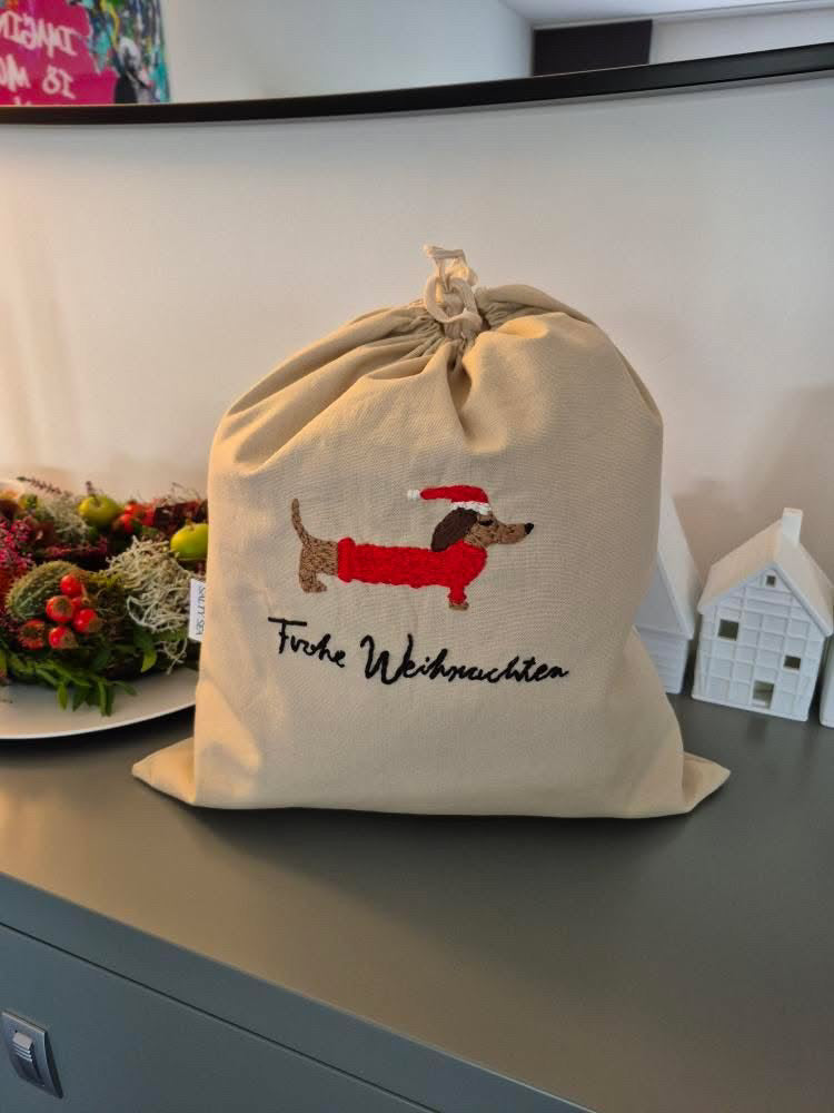 Unser zweifarbiger Weihnachtsdackel kommt gleich in mehreren Varianten daher: ihr könnt ihn mit Pullover, Schal oder sogar als kleinen Weihnachtsmann sticken. So wird jedes Säckchen zu einem ganz persönlichen Begleiter, der euch viele Jahre lang durch die Weihnachtszeit begleitet. Ein Säckchen, das nicht nur Geschenke trägt, sondern mit den Jahren selbst zur Tradition in der Weihnachtszeit wird.